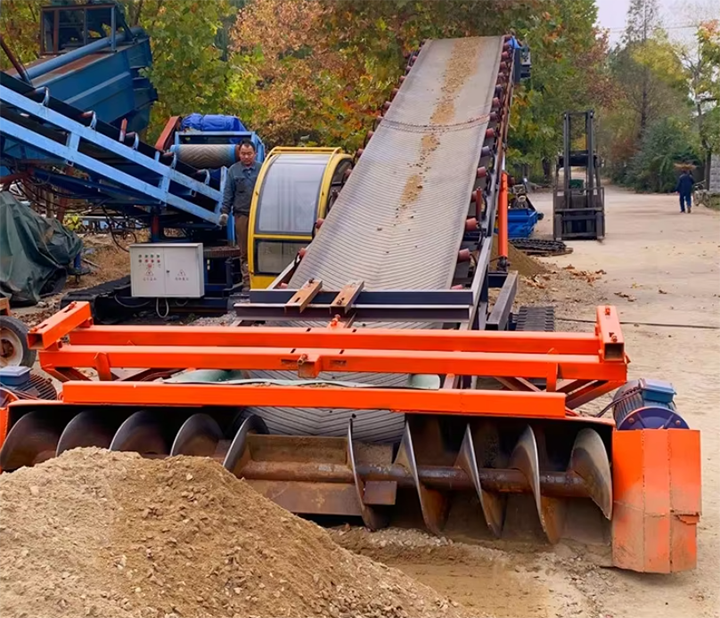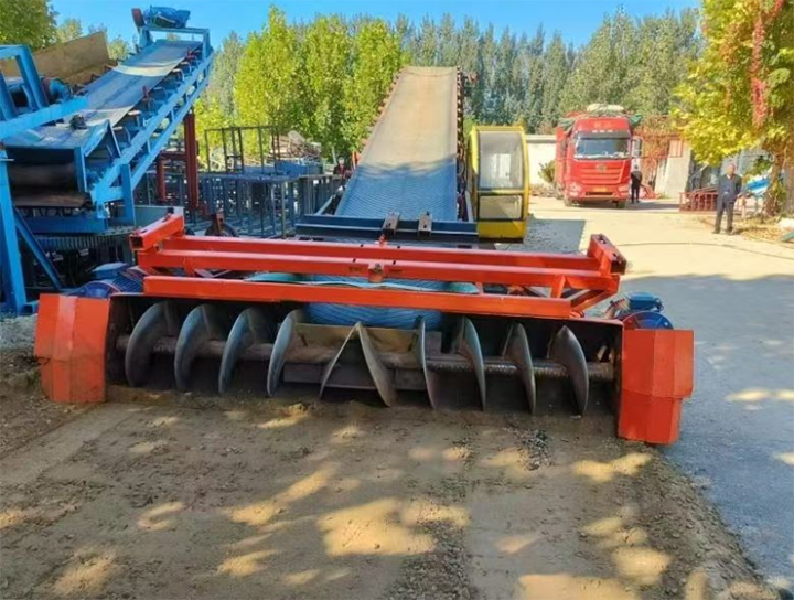 礦渣水泥廢料由地坑或料倉(cāng)經(jīng)給料機(jī)進(jìn)行下料,進(jìn)入皮帶輸送機(jī)系統(tǒng)。皮帶機(jī)采用耐磨橡膠帶,輸送機(jī)傾角≤18°,末端設(shè)置可調(diào)高度的裝車溜槽,直接對(duì)接卡車車廂。全線可以配置防塵罩、導(dǎo)料裙板及噴霧除塵系統(tǒng),減少揚(yáng)塵污染。該方案連續(xù)性好,維護(hù)成本低,適合場(chǎng)地較為開闊、水平輸送距離較長(zhǎng)的工況。